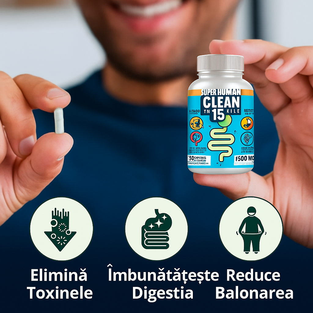 Clean15 detoxifică colonul, îmbunătățește digestia, ameliorează balonarea și promovează regularitatea intestinală în 12-24 de ore, folosind ingrediente 100% naturale precum Aloe Vera, Senna și Psyllium.